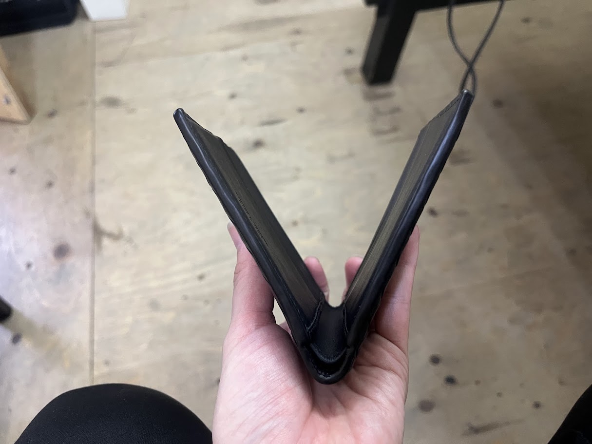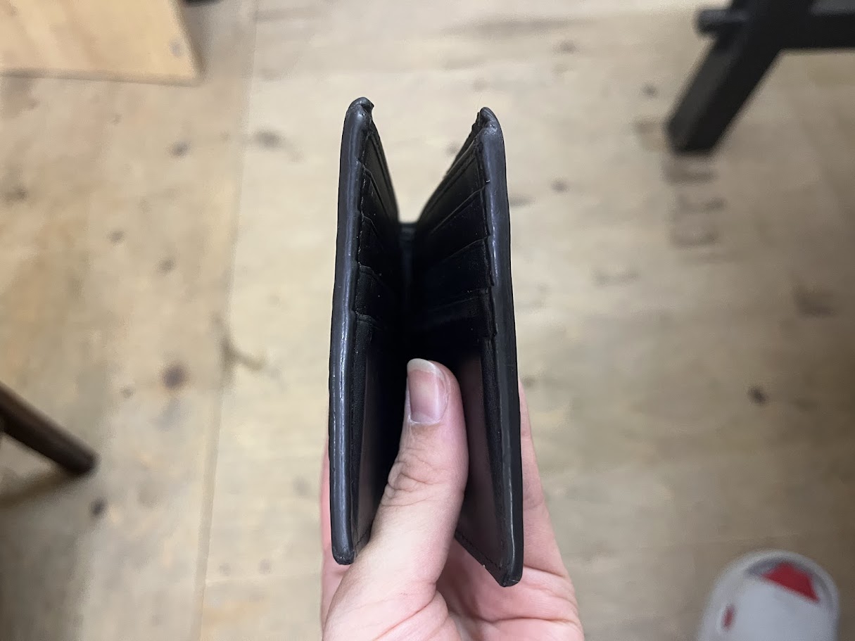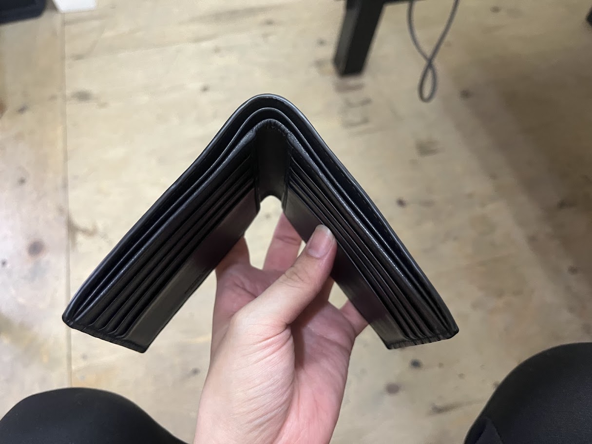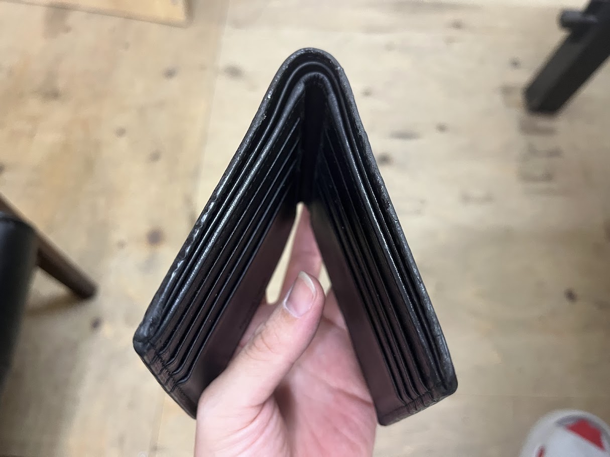 コバ(革の断面仕上げ)部分に剥がれや凹凸が発生し、手触りもベタベタとしています(´;ω;`)ウゥゥ